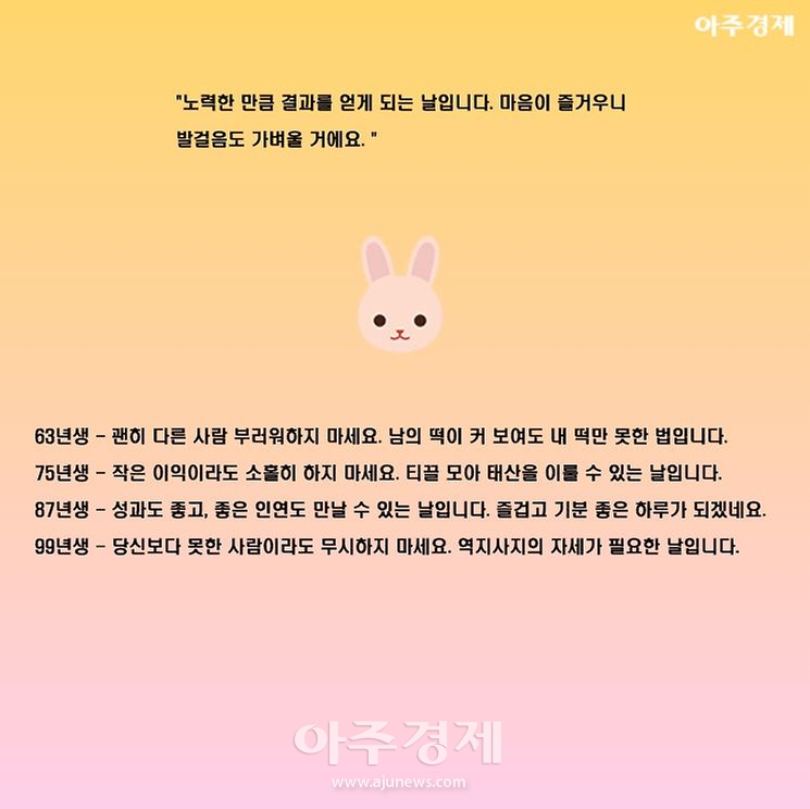 ▶토끼띠 오늘의 운세 "노력한 만큼 결과를 얻게 되는 날입니다. 마음이 즐거우니 발걸음도 가벼울 거에요. "