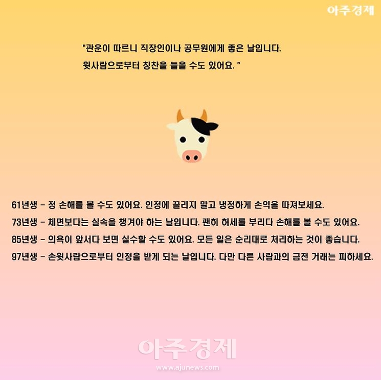 69년생 - 당신의 직감대로 움직이세요. 오늘은 재물운과 대인운이 아주 좋은 날입니다.