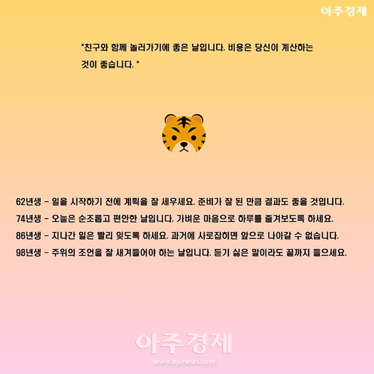 ▶호랑이띠 오늘의 운세 "친구와 함께 놀러가기에 좋은 날입니다. 비용은 당신이 계산하는 것이 좋습니다. "