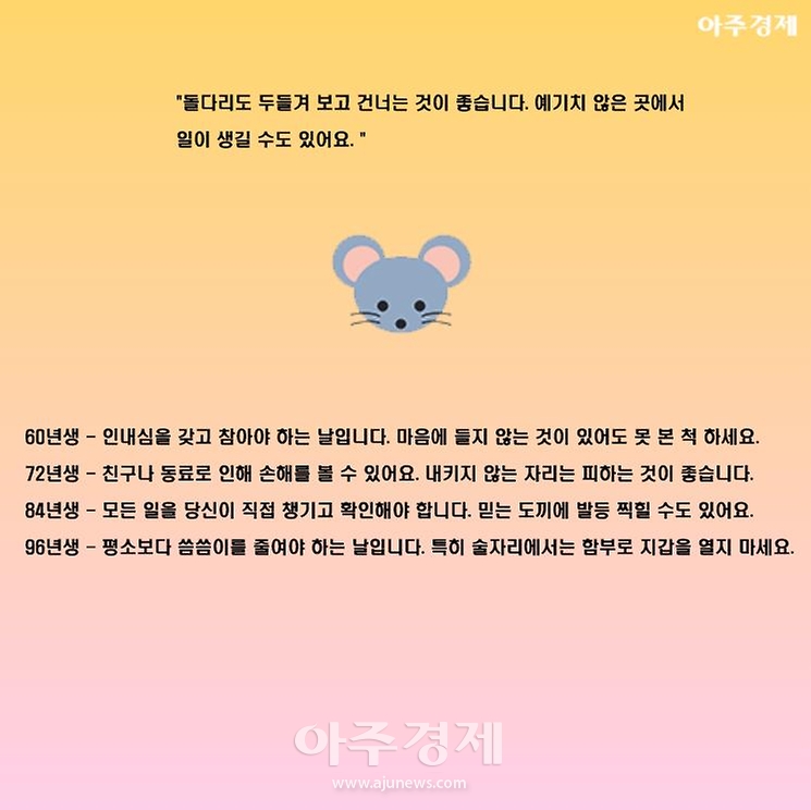 ▶쥐띠 오늘의 운세 "돌다리도 두들겨 보고 건너는 것이 좋습니다. 예기치 않은 곳에서 일이 생길 수도 있어요. "