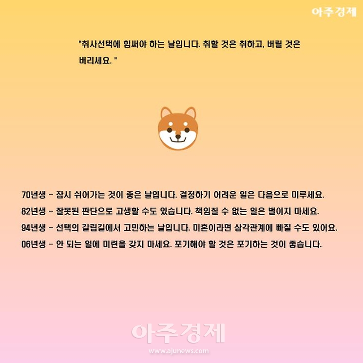 ▶개띠 오늘의 운세 "취사선택에 힘써야 하는 날입니다. 취할 것은 취하고, 버릴 것은 버리세요. "