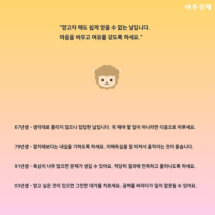 ▶양띠 오늘의 운세 "얻고자 해도 쉽게 얻을 수 없는 날입니다. 마음을 비우고 여유를 갖도록 하세요."