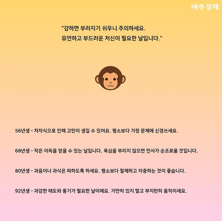 ▶원숭이띠 오늘의 운세 "강하면 부러지기 쉬우니 주의하세요. 유연하고 부드러운 처신이 필요한 날입니다."