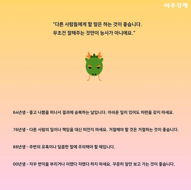 ▶용띠 오늘의 운세 "다른 사람들에게 할 말은 하는 것이 좋습니다. 무조건 잘해주는 것만이 능사가 아니에요."