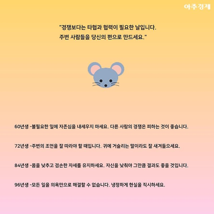 ▶쥐띠 오늘의 운세 "경쟁보다는 타협과 협력이 필요한 날입니다. 주변 사람들을 당신의 편으로 만드세요. "