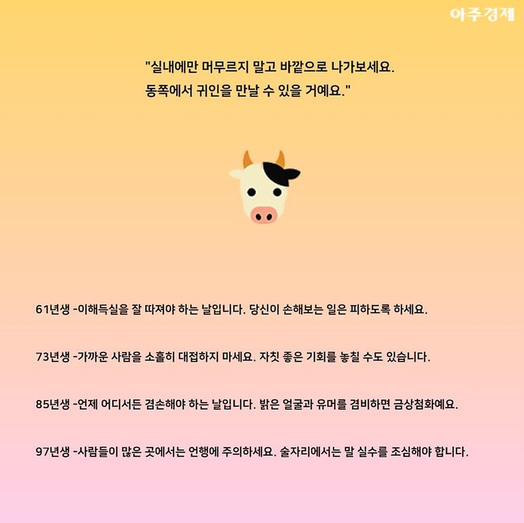 ▶소띠 오늘의 운세 "실내에만 머무르지 말고 바깥으로 나가보세요. 동쪽에서 귀인을 만날 수 있을 거에요. "