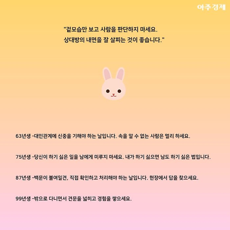 ▶토끼띠 오늘의 운세 "겉모습만 보고 사람을 판단한지 마세요. 상대방의 내면을 잘 살피는 것이 좋습니다. "