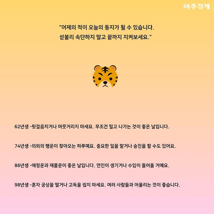 ▶호랑이띠 오늘의 운세 "어제의 적이 오늘의 동지가 될 수 있습니다. 섣불리 속단하지 말고 끝까지 지켜보세요. "