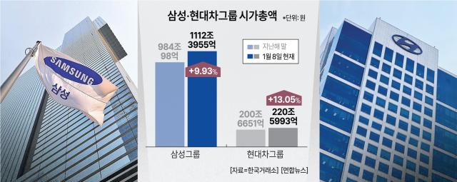 8일 한국거래소에 따르면 삼성그룹 시가총액은 지난해 말 대비 13% 증가한 1112조3955억원으로 집계됐다. 불과 5거래일 만에 시총이 약 130조원 이상 불었다. 같은 기간 현대차그룹 역시 시총이 220조5993억원으로 10% 늘어 약 20조원의 자금이 유입됐다. 연초 증시 분위기가 아직 완전히 살아나지 않은 상황에서 이들 대형 그룹주가 지수 상승을 이끌고 있다.