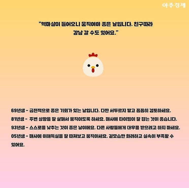 ▶닭띠 오늘의 운세 "역마살이 들어오니 움직여야 좋은 날입니다. 친구따라 강남 갈 수도 있어요."