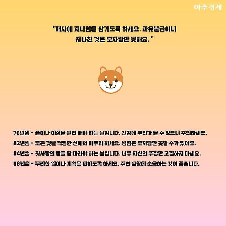▶개띠 오늘의 운세 "매사에 지나침을 삼가도록 하세요. 과유불급이니 지나친 것은 모자람만 못해요. "