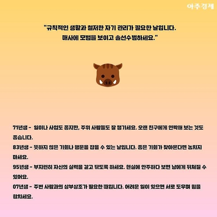▶돼지띠 오늘의 운세 "규칙적인 생활과 철저한 자기 관리가 필요한 날입니다. 매사에 모범을 보이고 솔선수범하세요."