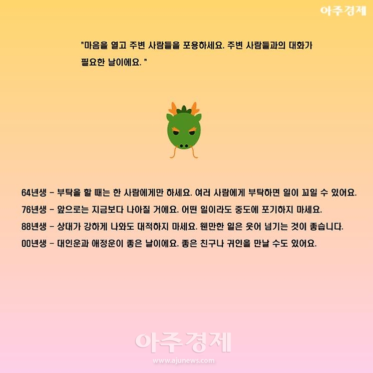 ▶용띠 오늘의 운세 "마음을 열고 주변 사람들을 포용하세요. 주변 사람들과의 대화가 필요한 날이에요. "