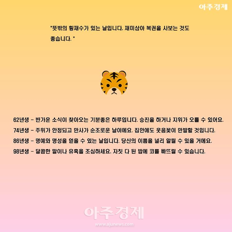 ▶호랑이띠 오늘의 운세 "뜻밖의 횡재수가 있는 날입니다. 재미삼아 복권을 사보는 것도 좋습니다. "