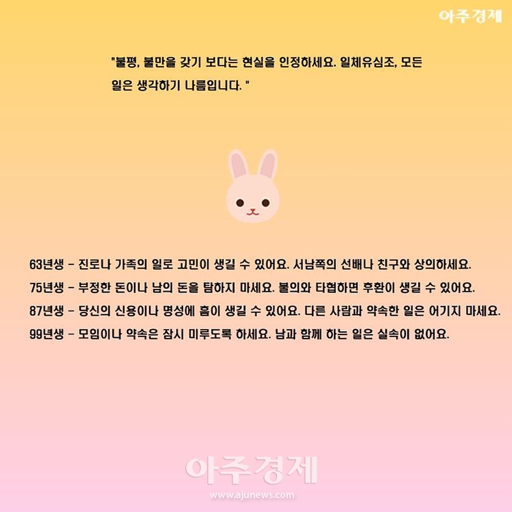 ▶토끼띠 오늘의 운세 "불평, 불만을 갖기 보다는 현실을 인정하세요. 일체유심조, 모든 일은 생각하기 나름입니다. "