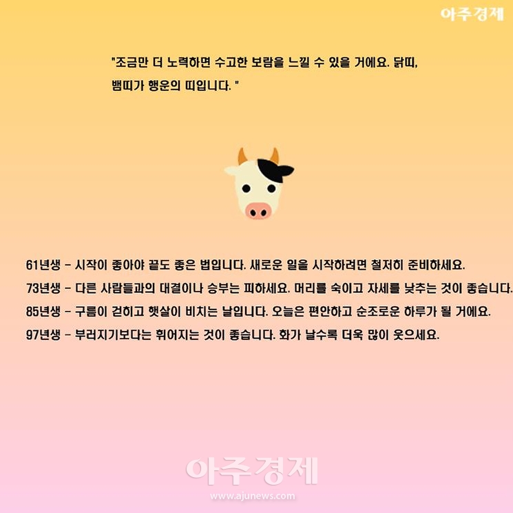 ▶소띠 오늘의 운세 "조금만 더 노력하면 수고한 보람을 느낄 수 있을 거에요. 닭띠, 뱀띠가 행운의 띠입니다. "