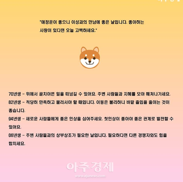 ▶개띠 오늘의 운세 "애정운이 좋으니 이성과의 만남에 좋은 날입니다. 좋아하는 사랑이 있다면 오늘 고백하세요."