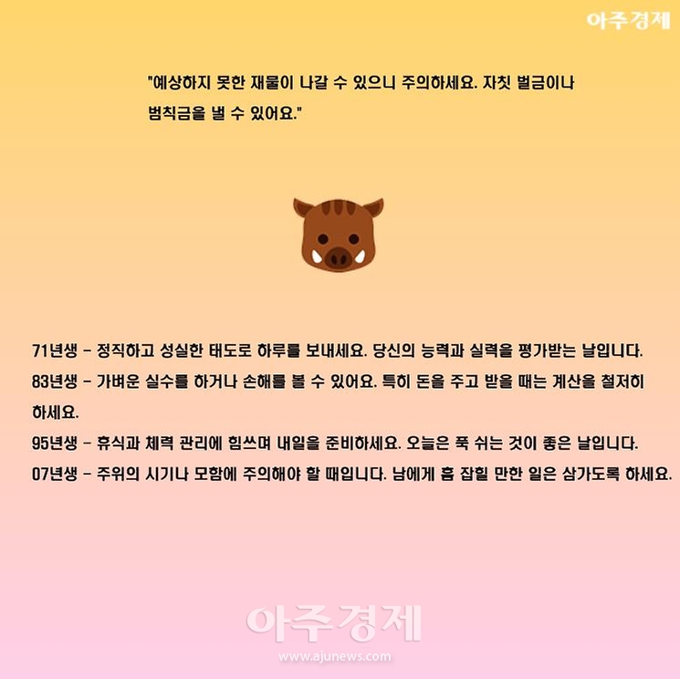 ▶돼지띠 오늘의 운세 "예상하지 못한 재물이 나갈 수 있으니 주의하세요. 자칫 벌금이나 범칙금을 낼 수 있어요."