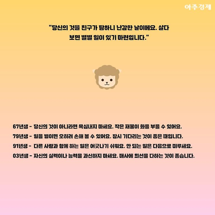 ▶양띠 오늘의 운세 "당신의 것을 친구가 탐하니 난감한 날이에요. 살다 보면 별별 일이 있기 마련입니다."