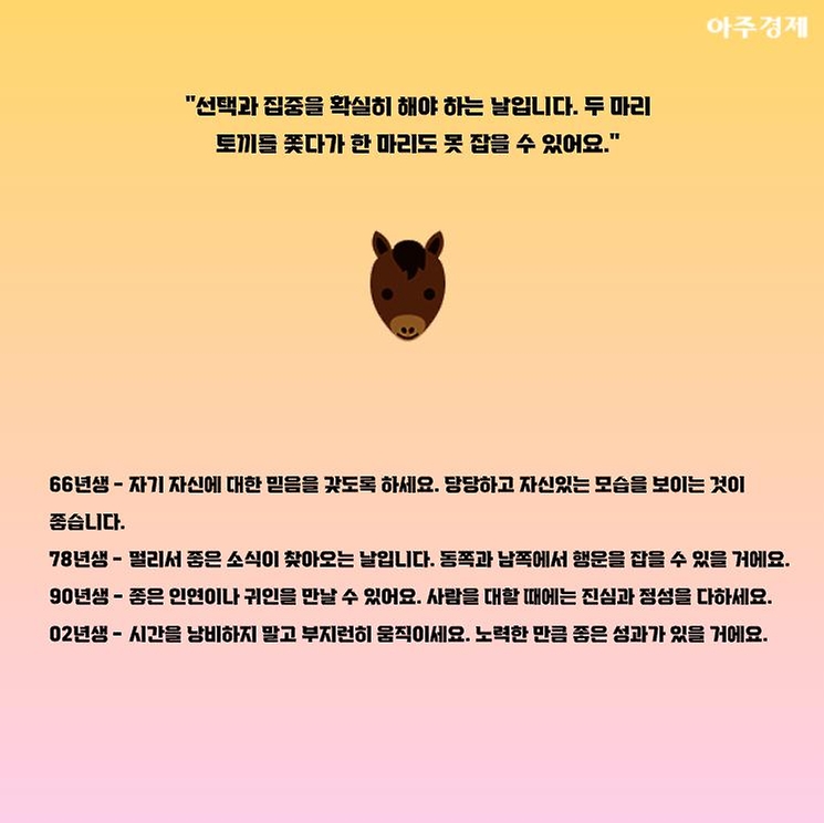▶말띠 오늘의 운세 "선택과 집중을 확실히 해야 하는 날입니다. 두 마리 토끼를 쫓다가 한 마리도 못 잡을 수 있어요."