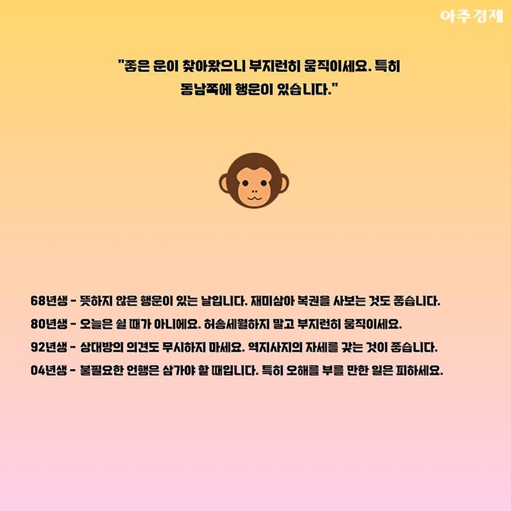 ▶원숭이띠 오늘의 운세 "좋은 운이 찾아왔으니 부지런히 움직이세요. 특히 동남쪽에 행운이 있습니다."