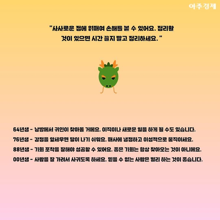 ▶용띠 오늘의 운세 "사사로운 정에 얽매여 손해를 볼 수 있어요. 정리할 것이 있으면 시간 끌지 말고 정리하세요. "