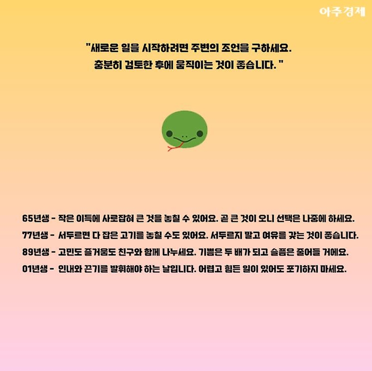 ▶뱀띠 오늘의 운세 "새로운 일을 시작하려면 주변의 조언을 구하세요. 충분히 검토한 후에 움직이는 것이 좋습니다. "