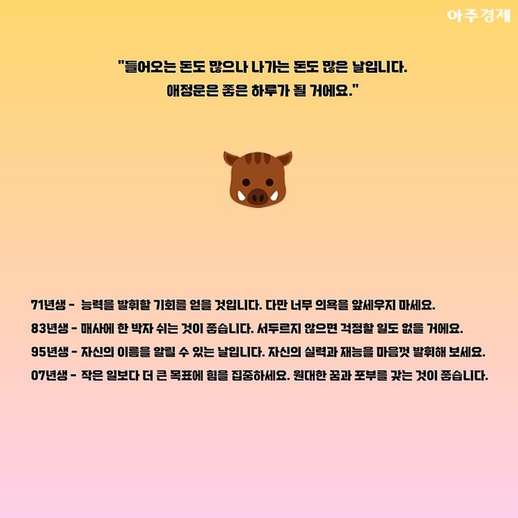▶돼지띠 오늘의 운세 "들어오는 돈도 많으나 나가는 돈도 많은 날입니다. 애정운은 좋은 하루가 될 거에요."