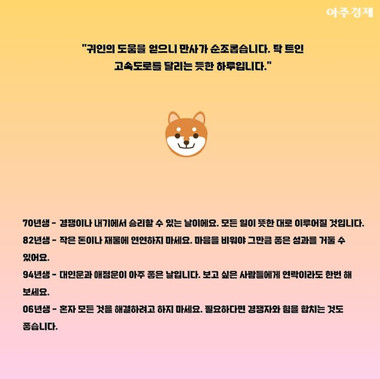 ▶개띠 오늘의 운세 "귀인의 도움을 얻으니 만사가 순조롭습니다. 탁 트인 고속도로를 달리는 듯한 하루입니다."