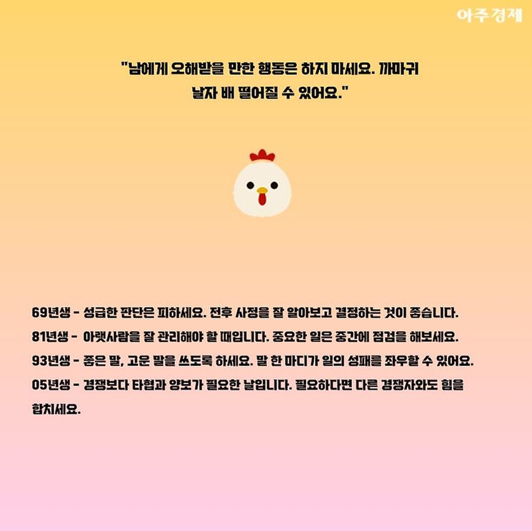 ▶닭띠 오늘의 운세 "남에게 오해받을 만한 행동은 하지 마세요. 까마귀 날자 배 떨어질 수 있어요."