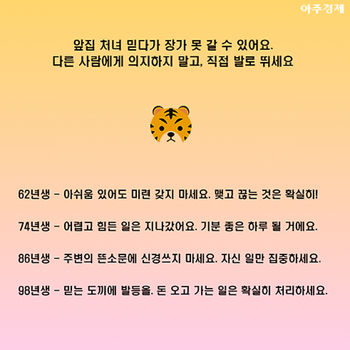 ▶호랑이띠 오늘의 운세 "앞집 처녀 믿다가 장가 못 갈 수 있어요. 다른 사람에게 의지하지 말고, 직접 발로 뛰세요. "