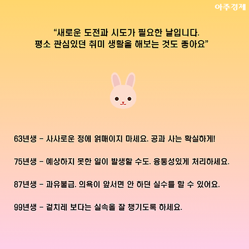 ▶토끼띠 오늘의 운세 "새로운 도전과 시도가 필요한 날입니다. 평소 관심있던 취미 생활을 해보는 것도 좋아요. "