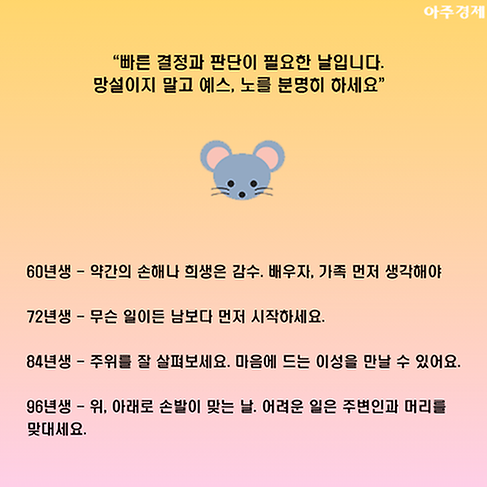 ▶쥐띠 오늘의 운세 "빠른 결정과 판단이 필요한 날입니다. 망설이지 말고 예스, 노를 분명히 하세요. "