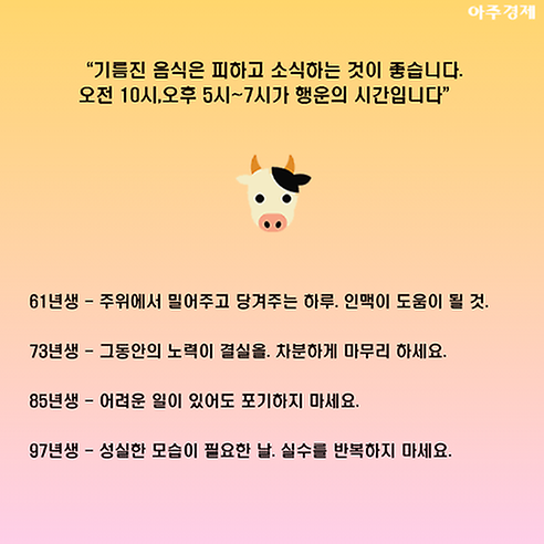 ▶소띠 오늘의 운세 "기름진 음식은 피하고 소식(小食)하는 것이 좋습니다. 오전 10시,오후 5시~7시가 행운의 시간입니다. "