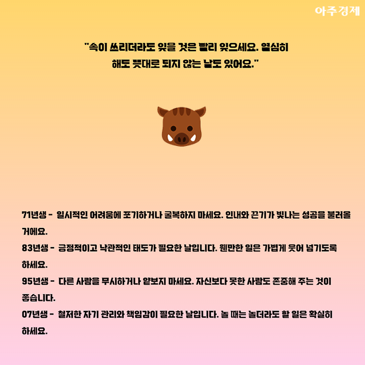 ▶돼지띠 오늘의 운세 "속이 쓰리더라도 잊을 것은 빨리 잊으세요. 열심히 해도 뜻대로 되지 않는 날도 있어요."