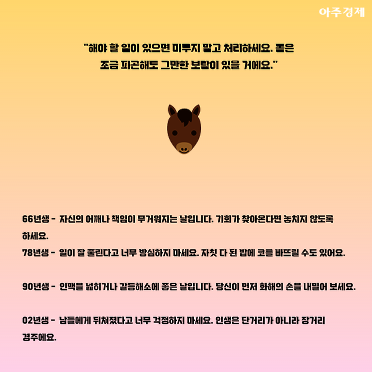 ▶말띠 오늘의 운세 "해야 할 일이 있으면 미루지 말고 처리하세요. 몸은 조금 피곤해도 그만한 보람이 있을 거에요."
