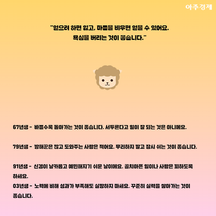 ▶양띠 오늘의 운세 "얻으려 하면 잃고, 마음을 비우면 얻을 수 있어요. 욕심을 버리는 것이 좋습니다."