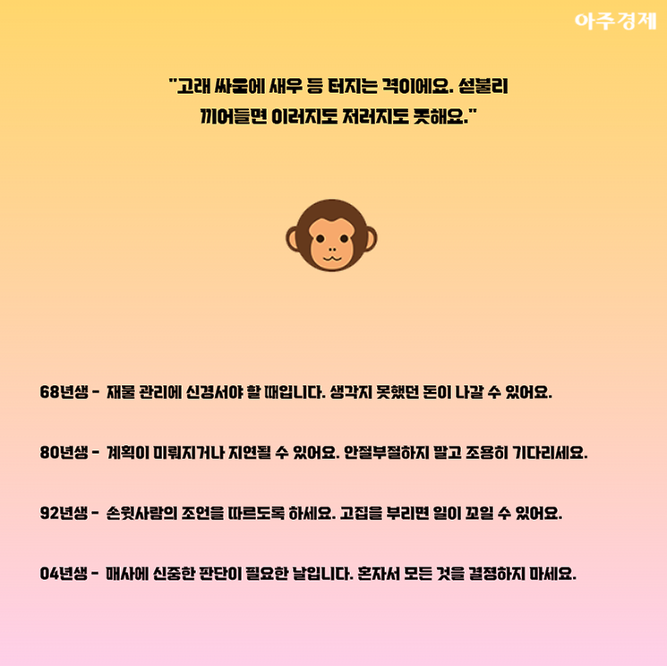 ▶원숭이띠 오늘의 운세 "고래 싸움에 새우 등 터지는 격이에요. 섣불리 끼어들면 이러지도 저러지도 못해요."