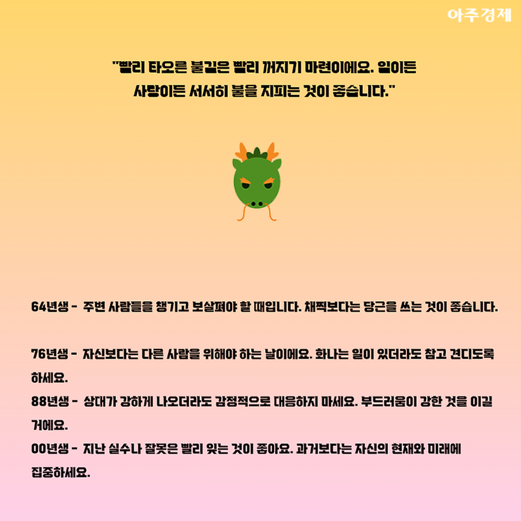 ▶용띠 오늘의 운세 "빨리 타오른 불길은 빨리 꺼지기 마련이에요. 일이든 사랑이든 서서히 불을 지피는 것이 좋습니다."