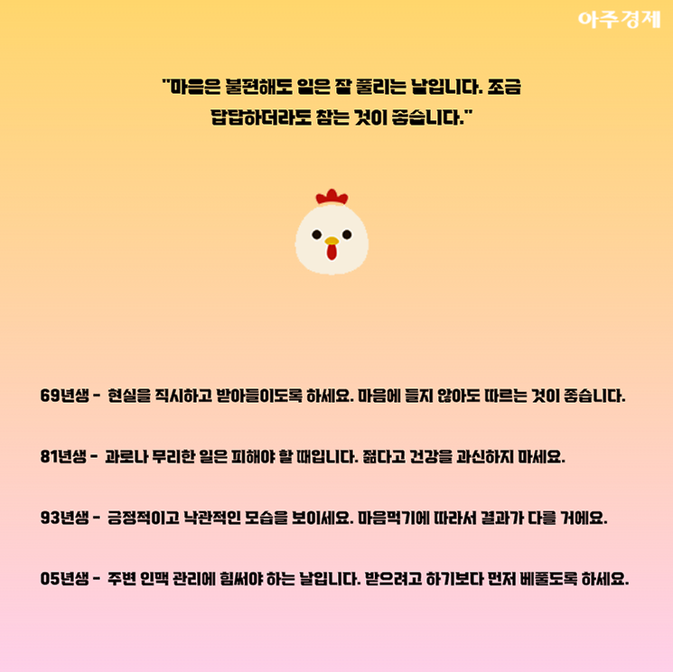 ▶닭띠 오늘의 운세 "마음은 불편해도 일은 잘 풀리는 날입니다. 조금 답답하더라도 참는 것이 좋습니다."