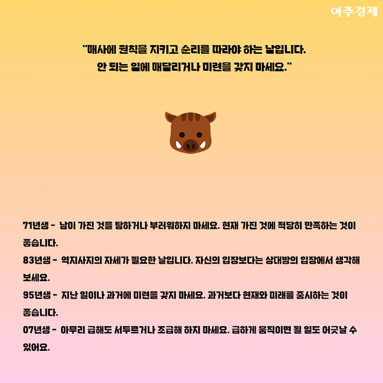 ▶돼지띠 오늘의 운세 "매사에 원칙을 지키고 순리를 따라야 하는 날입니다. 안 되는 일에 매달리거나 미련을 갖지 마세요."