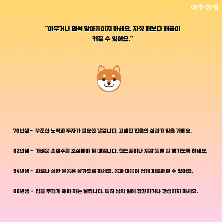 ▶개띠 오늘의 운세 "아무거나 덥석 받아들이지 마세요. 자칫 배보다 배꼽이 커질 수 있어요."