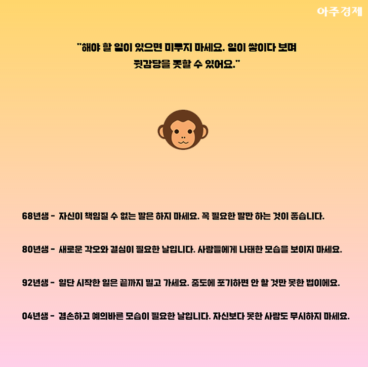 ▶원숭이띠 오늘의 운세 "해야 할 일이 있으면 미루지 마세요. 일이 쌓이다 보며 뒷감당을 못할 수 있어요."