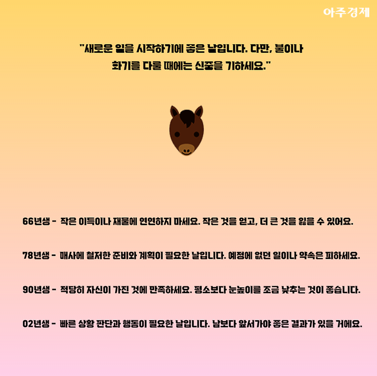 ▶말띠 오늘의 운세 "새로운 일을 시작하기에 좋은 날입니다. 다만, 불이나 화기를 다룰 때에는 신중을 기하세요."