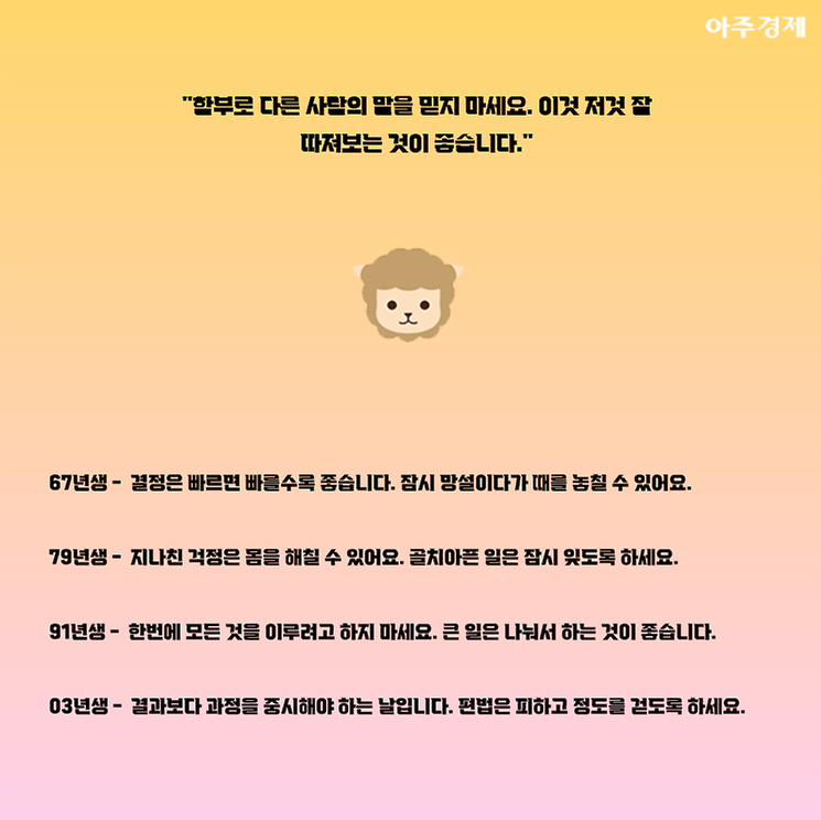▶양띠 오늘의 운세 "함부로 다른 사람의 말을 믿지 마세요. 이것 저것 잘 따져보는 것이 좋습니다."