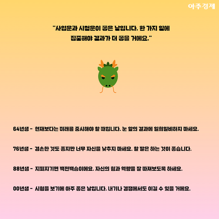 ▶용띠 오늘의 운세 "사업운과 시험운이 좋은 날입니다. 한 가지 일에 집중해야 결과가 더 좋을 거에요."