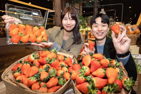 8일 서울 강남구 현대백화점 무역센터점 지하1층 식품관에서 직원들이 국내산 신품종 '골드베리딸기'를 소개하고 있다. 이번에 선보이는 골드베리딸기는 평균 당도가 14브릭스(Brix) 내외로 11~12브릭스인 일반 딸기보다 당도가 높고 단단하며, 아삭한 식감이 특징이다. 현대백화점은 다음 달 30일까지 압구정본점, 무역센터점, 판교점 등 전국 10개 점포 식품관에서 골드베리딸기를 판매한다. 판매 가격은 1팩(500g)에 2만 5000원이다. [사진=현대백화점]