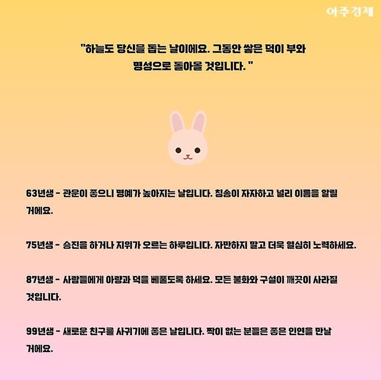 ▶토끼띠 오늘의 운세 "하늘도 당신을 돕는 날이에요. 그동안 쌓은 덕이 부와 명성으로 돌아올 것입니다. "