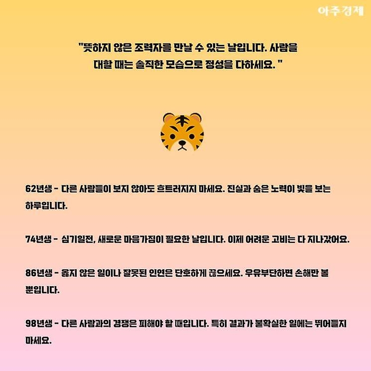 ▶호랑이띠 오늘의 운세 "뜻하지 않은 조력자를 만날 수 있는 날입니다. 사람을 대할 때는 솔직한 모습으로 정성을 다하세요. "