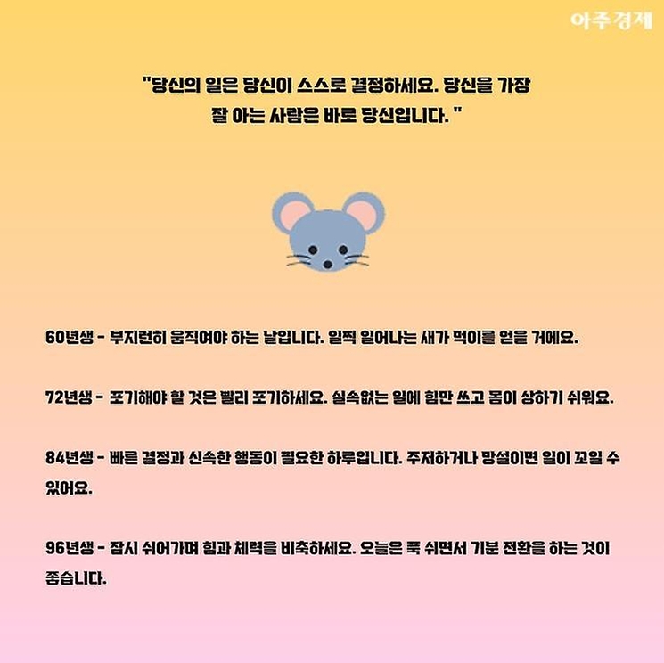 ▶쥐띠 오늘의 운세 "당신의 일은 당신이 스스로 결정하세요. 당신을 가장 잘 아는 사람은 바로 당신입니다. "
